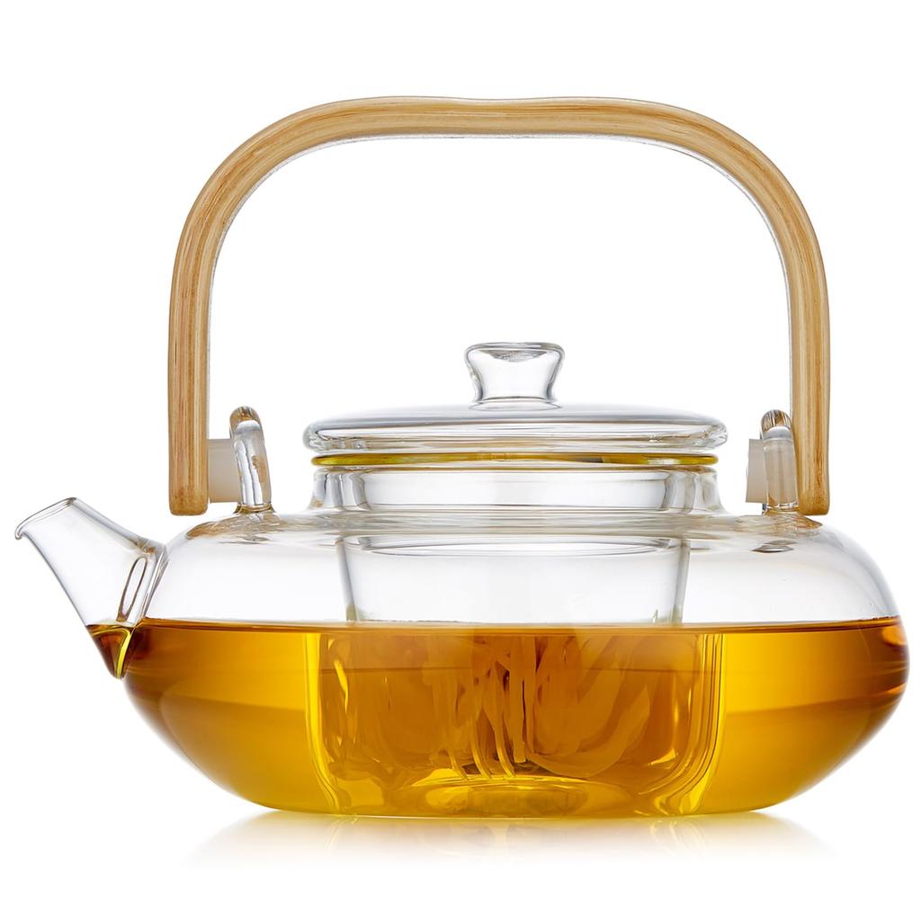 Dzbanek do herbaty Pokaro ze szkła żaroodpornego, 800 ml pojemności całkowitej, bambusowy uchwyt, płaski design, wbudowany zaparzacz, bezpieczny na kuchence, stylowy szklany dzbanek do herbaty,