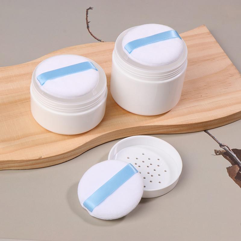 Pojemnik na sypki puder wielokrotnego napełniania 200/250/300g – Z sitkiem w wieczku i gąbeczką, do utrwalania, pudru typu „honey” i pudru do twarzy