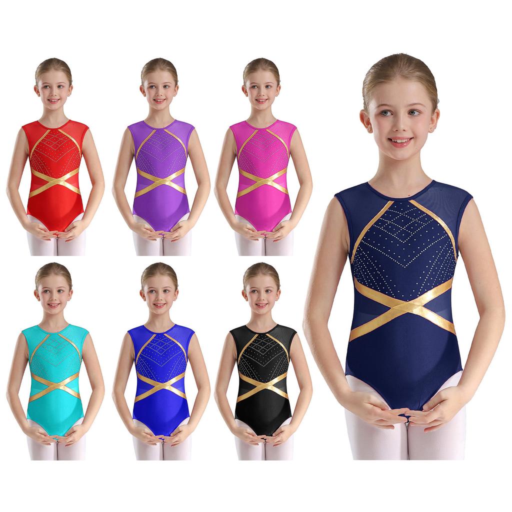 Dziewczęcy błyszczący trykot bez rękawów z cyrkoniami, z wycięciem na plecach, strój do gimnastyki i tańca
