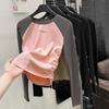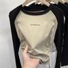 Spice Girl Fat mm Side Pleated Skinny Contrast Color Crew Neck Shoulder Long Sleeve T-Shirt Women's Autumn Bottom Shirt