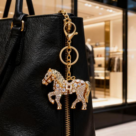 Stylowy design z kryształkami: Ten breloczek, ozdobiony uroczym motywem konia wykonanym z błyszczących sztucznych kryształków, dodaje odrobinę elegancji i osobowości.. Jasne, błyszczące wykończenie sprawia, że Twoje klucze wyróżniają się, co ułatwia ich lokalizację w torbach lub kieszeniach.