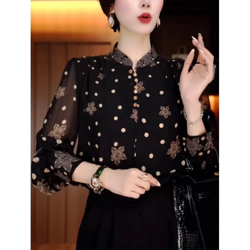 Damska wiosenna elegancka koszula typu pulower w kropki ze stójką i guzikami. Damska luźna, wyszczuplająca góra.