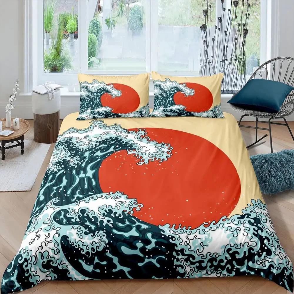 Ocean Wave King Queen Duvet Cover Red Sun Bedding Set Japanese Ukiyo-E Comforter Cover Exotic Navy Blue Polyester Quilt Cover