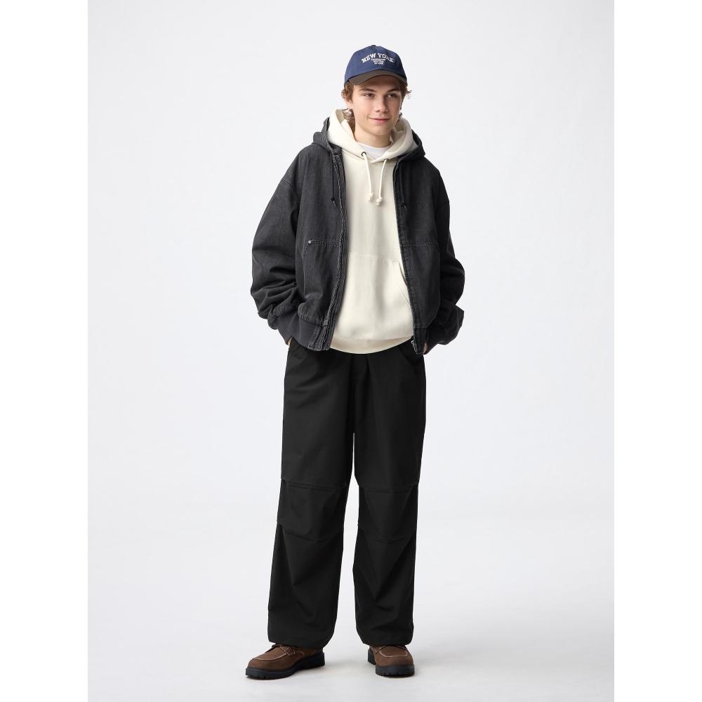 Szerokie spodnie spadochronowe od GU by Uniqlo mają głęboki stan i obszerny, szeroki krój.. Zapewnia elegancką i trójwymiarową sylwetkę widzianą z boku.. Możesz cieszyć się zmieniającymi się sylwetkami dzięki regulowanemu ściągaczowi na dole, podczas gdy zaszewki przy kolanach dodają akcentu do sylwetki.. Jest wykonany z wytrzymałego materiału poliestrowego.