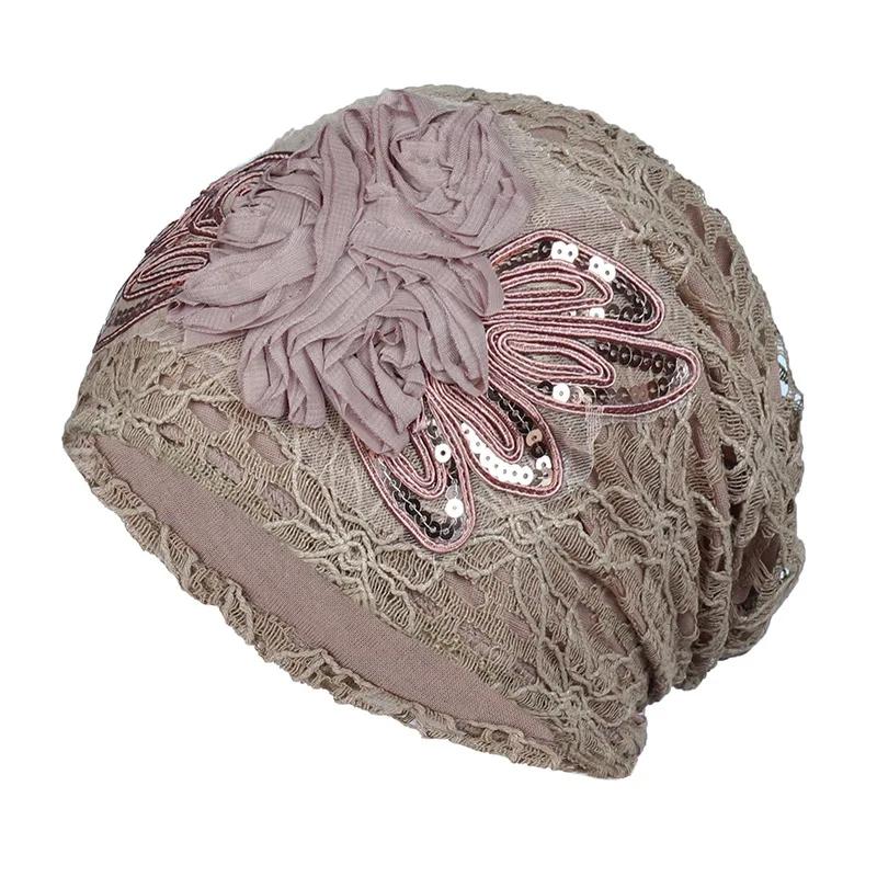 Elegant Women Sequins Lace Turban Cap Flowers Muslim Headwear Hat Female Head Wraps Ladies Headscarf Bonnet Turbante Mejur