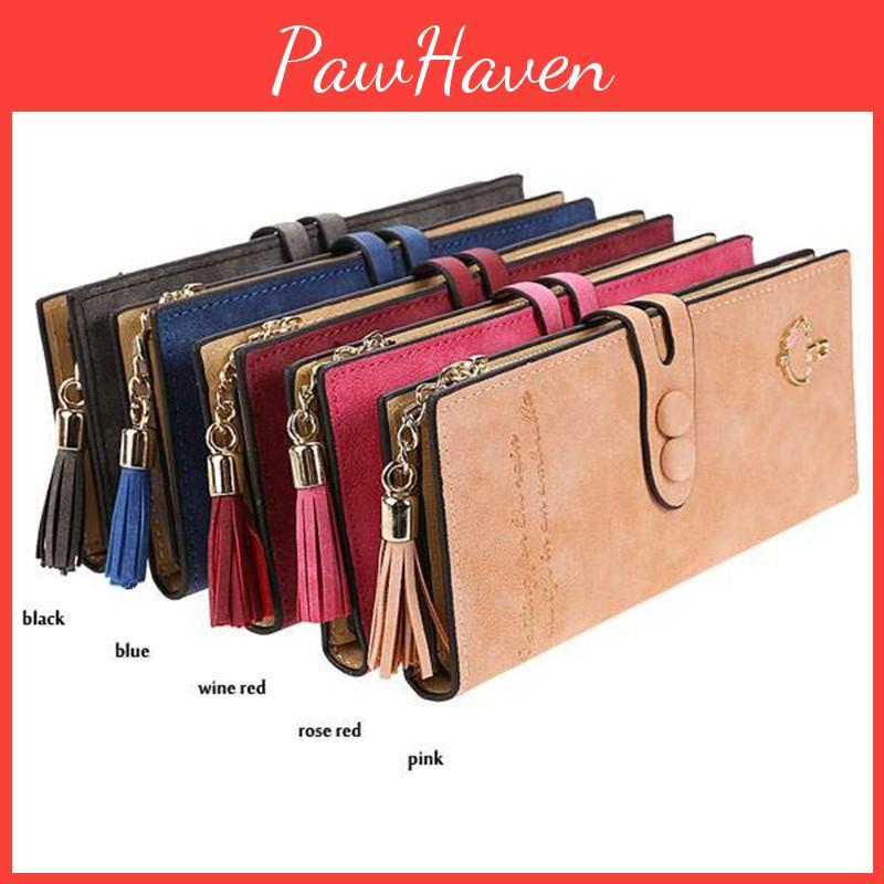 Elegant Women Leather Card Holder Long Trifold Wallet With Tassel And Checkbook Pocket