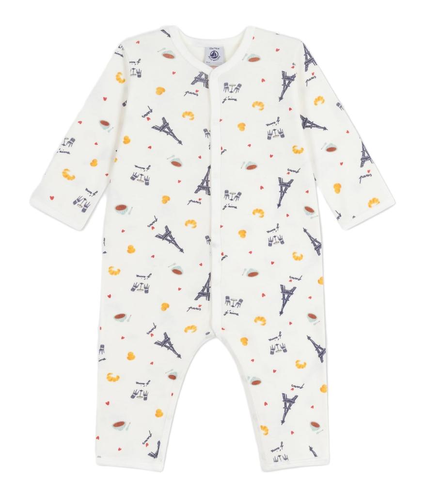 This footless romper features a cute print of the Eiffel Tower, croissants, and cafes, evoking a Parisian atmosphere. Made from eco-friendly, 1x1 rib-knit cotton, it's so comfortable it feels like a second skin, ensuring a comfortable and natural fit. The wide front opening makes it easy to put on and take off, and it's a great item to have in your wardrobe, making it a wonderful gift for baby showers and other special occasions. Note: The print is not permanent and may crack with rubbing or friction, or fade or come off with repeated washing. Wash separately with a mild detergent.