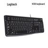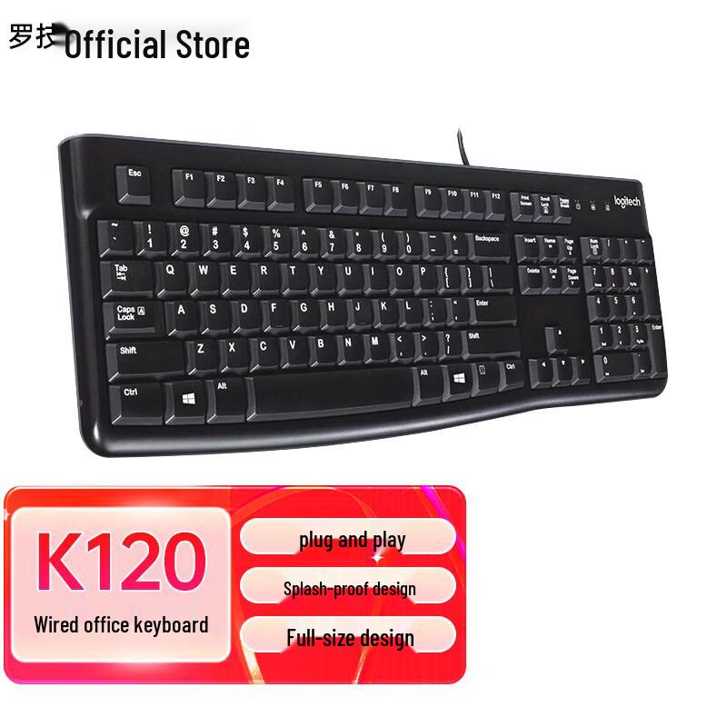 The Logitech K120 is a reliable, full-size wired keyboard designed for office and home use. It features a durable, spill-resistant design with comfortable, low-profile keys and a standard layout with over 100 keys. This black membrane keyboard connects via USB and is compatible with Windows and macOS, offering a simple plug-and-play experience without backlighting.