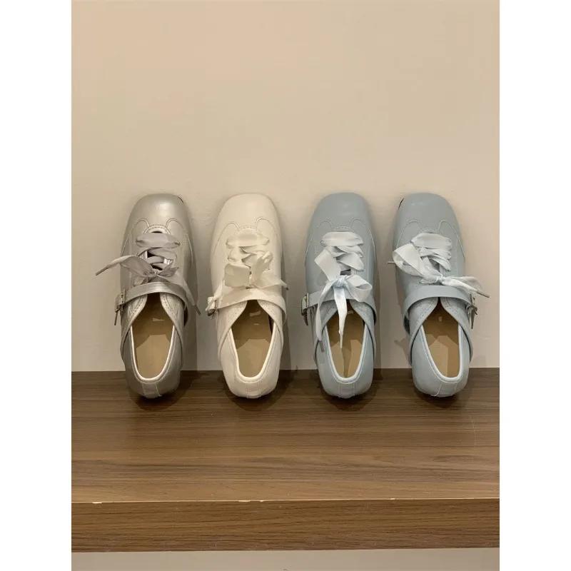 Moda 2025 Nowe Słodkie Damskie Baleriny Sznurowane Kwadratowy Nosek Pasek z Klamrą Wygodne Lekkie Niski Obcas Buty Codzienne Damskie