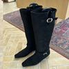 Fashion Fashion Flock Women Knee High Boots With Wedges Low Heel Shoes Buckle Female Pointed Toe Ladies Long Modern Boots Shoes