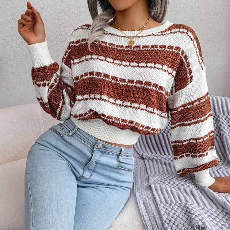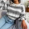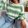 Long Sleeve Loose Knit Sweater for Women O Neck All Match Contrast Fall Winter S-L