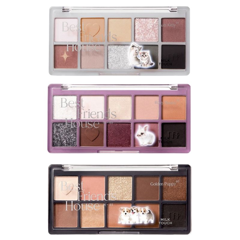 The MILK TOUCH Best Friends House Eye Palette is a versatile eyeshadow palette that captures different moods with three distinct color stories — “Ash Kitty”, “Rosy Bunny”, and “Golden Puppy.” It combines multiple textures (matte, shimmer, glitter, jelly-like finishes, and even stamp-texture effects) to let you create anything from soft, natural daytime looks to bold, expressive eye makeup.