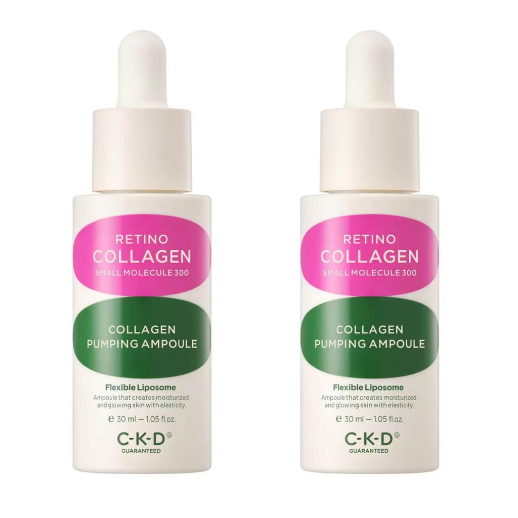 The CKD Retino Collagen Pumping Ampoule is an intensive anti-aging serum that combines gentle retinoid derivatives with collagen to improve elasticity, smooth fine lines, and refine overall skin texture. Its lightweight, fast-absorbing formula delivers deep hydration while promoting a firmer, more youthful look. Ideal for dull, uneven, or aging skin, this ampoule supports skin renewal with minimal irritation. This value set includes two full-size 30ml bottles for consistent daily care.