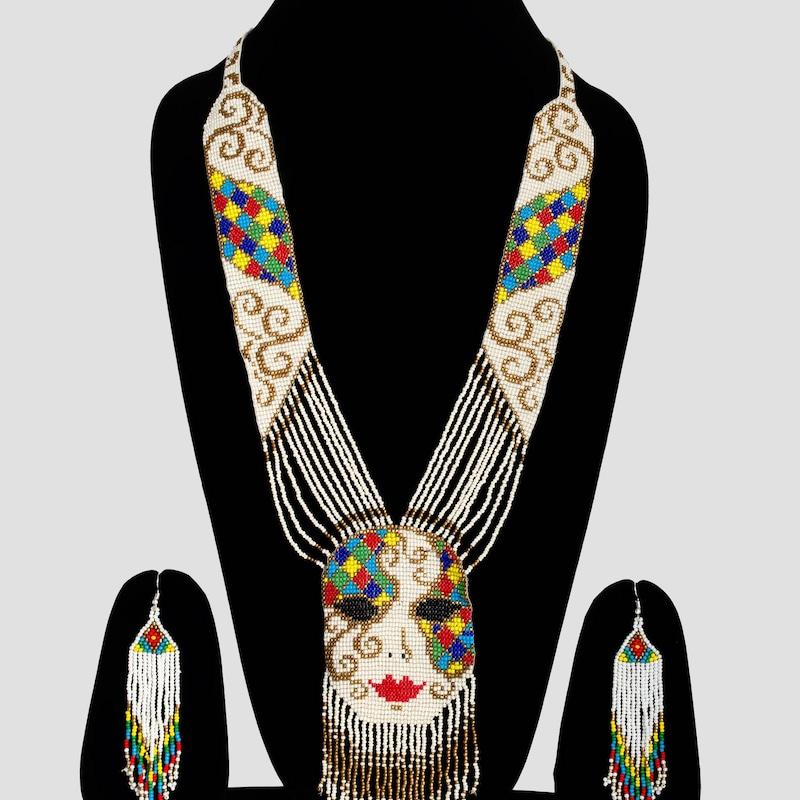 Naszyjnik z koralików seed z abstrakcyjną twarzą kobiety: Wielobarwna biżuteria hippisowska