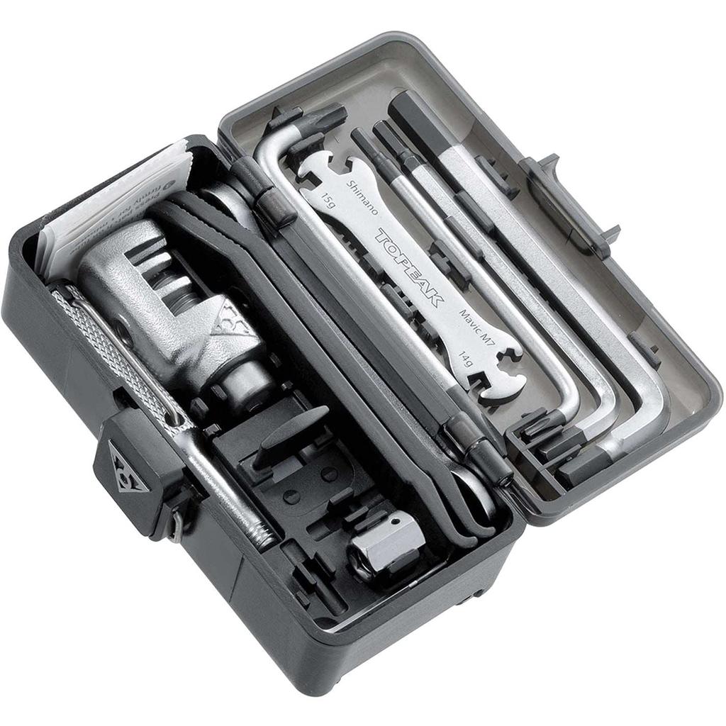 - Korpus z tworzywa technicznego - Klucze nasadowe: 1.5, 2, 2.5, 3, 4, 5, 6mm - Klucze Torx: T15, T25 - Klucz pudełkowy: 8mm - Klucz otwarty: 10mm - Klucz do szprych: dla 14G, 15G, MAVIC M7, Shimano - Narzędzie do łańcucha (kompatybilny z SHIMANO HG, UG, IG) - Hak łańcuchowy - Łyżki do opon (2 kawałki) - (Phillips) Śrubokręt - (Szczeliny) śrubokręt - Flypaper bezklejowy zestaw łatek *Plastikowe łyżki do opon mogą pęknąć przy użyciu zbyt dużej siły.