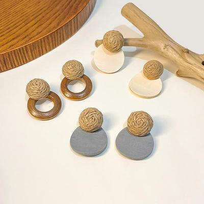 1 para kolczyków sztyftów w stylu retro, rustykalnym, prostym, casualowym, artystycznym, z drewnianym wydrążonym pierścieniem i wstawkami ze słomy rafii, kolczyki damskie na randkę