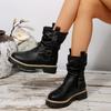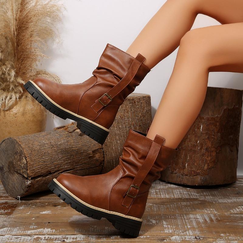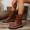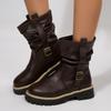 Damskie botki na szeroką stopę z okrągłym noskiem na słupku - marszczone botki slouch z klamrą na jesień/zimę, retro brytyjski styl, botki na masywnym obcasie