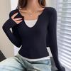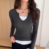 Ladies Spring Autumn Long Sleeve Solid Color False Two-piece Bodycon T Shirt Top