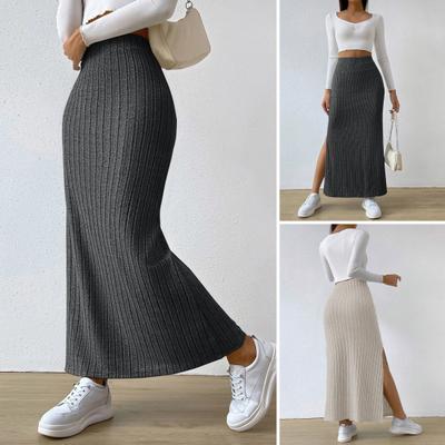 Spódnica Maxi z Rozcięciami po Bokach Spódnica Długa Prążkowana z Wysokim Stanem Jednolity Kolor Ołówkowa Jesień Zima