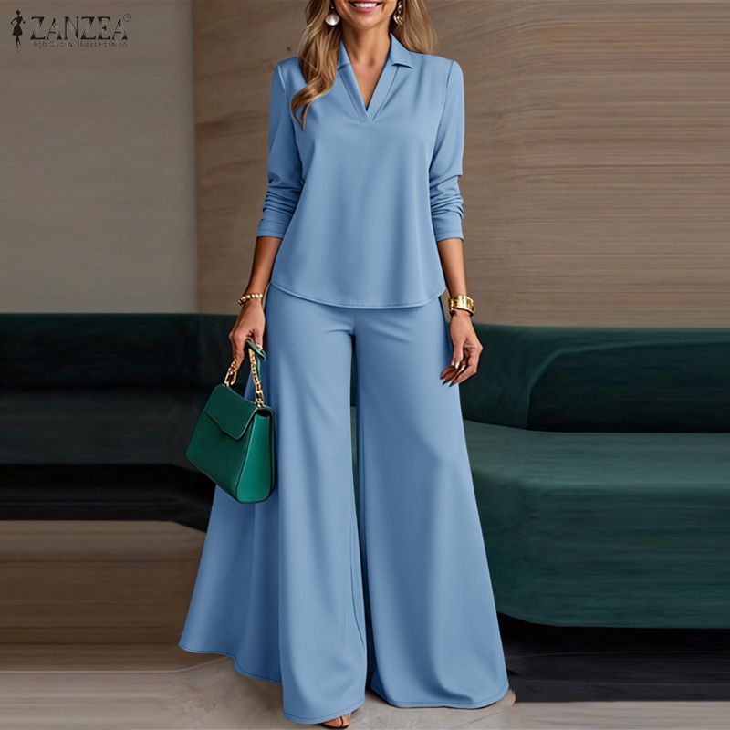 ZANZEA Damska Bluzka z Długim Rękawem i Spodnie z Szerokimi Nogawkami Casualowe Dwuczęściowe Zestawy