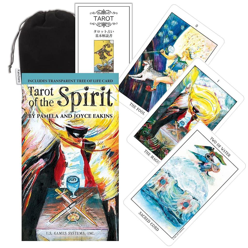 Tarot Ducha to głęboko wnikliwa talia, bogata w różnorodne ilustracje.. Jest to talia tarota stworzona wokół tematu "Duch". Karty zawierają ilustracje symbolizujące cztery duchy żywiołów.: duchy wody (Undyny), duchy ognia (Salamandry), duchy wiatru (Sylfidy), i duchy ziemi (Gnomy), oddane w bogatych, głębokich kolorach przypominających obrazy olejne. Zawierające unikalne ilustracje, które wydają się ujawniać prawdziwą esencję ludzkiego serca, te karty tarota podnoszą ducha osoby, która ich używa, i oferują wgląd w głębie świadomości.. Zestaw zawiera 78 standardowych kart, jedną kartę bonusową i przezroczystą kartę przedstawiającą Drzewo Życia, co daje łącznie 80 kart.