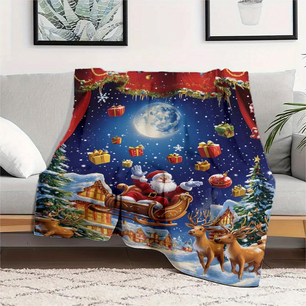 Flanelowy koc świąteczny 280 gsm - Miękki sezonowy pled ze Świętym Mikołajem, reniferami i płatkami śniegu - Wielofunkcyjny przytulny koc do drzemki na łóżko,
