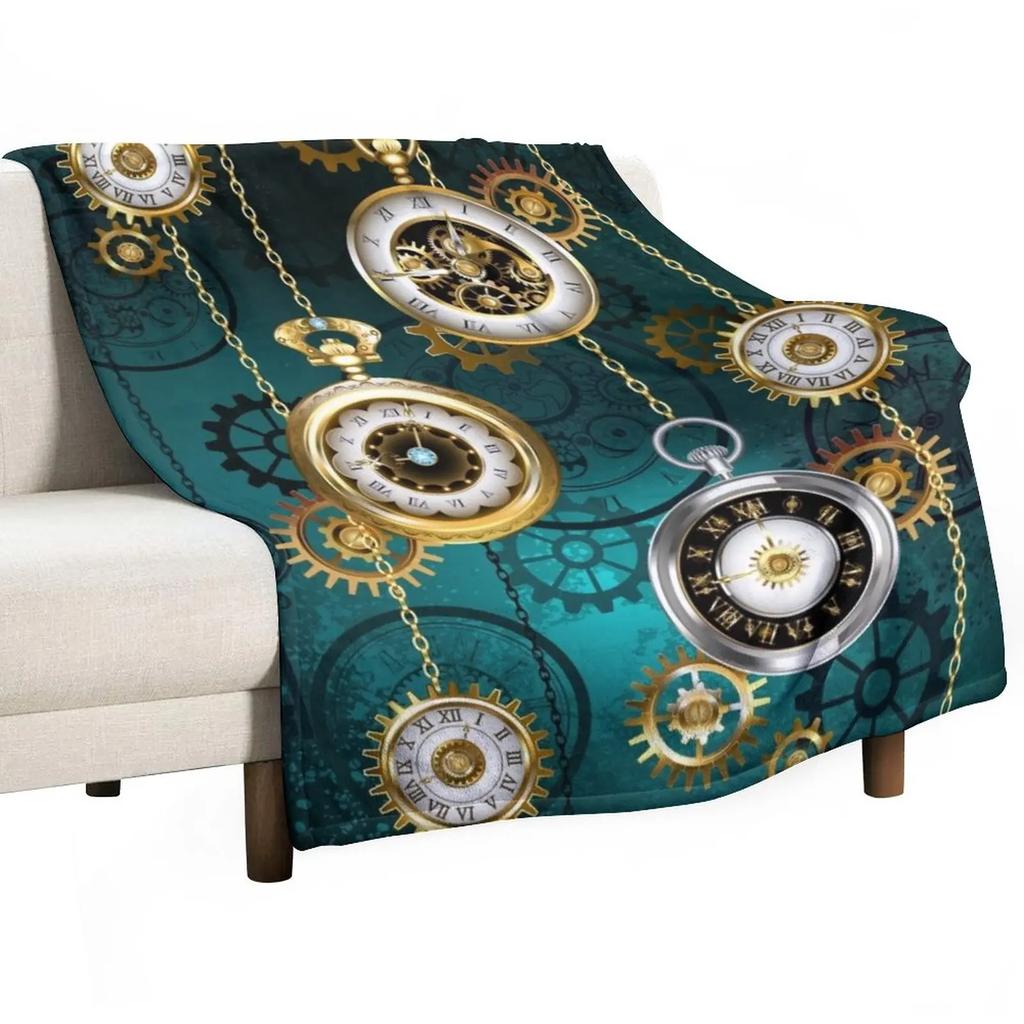 Steampunkowy Zegarek z Łańcuszkami na Zielonym Tle Koc Koc na Kanapę Dekoracyjny Koc na Kanapę