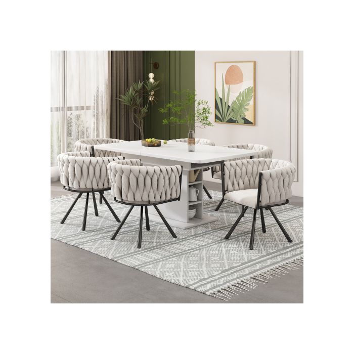 Chaises de salle à manger en lin, ensemble de 6, avec quatre pieds en métal, tissu de lin beige et noir