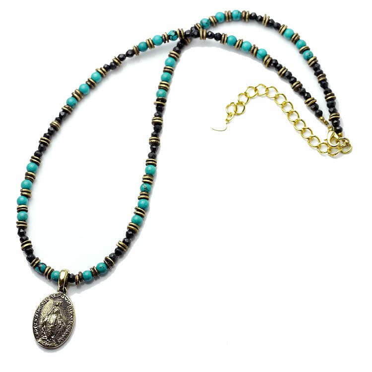Silver One se Virgin Mary Necklace with Miraculous Medal, Turquoise, and Black Spinel [43cm Long] Natural Stone Beads for Men