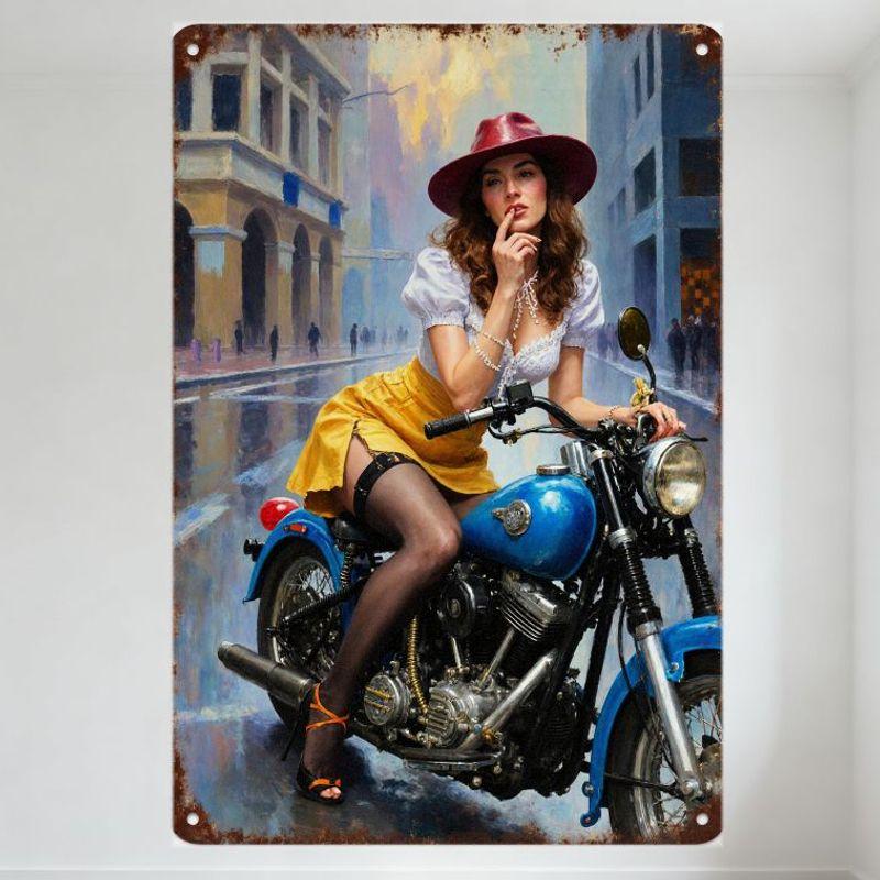Vintage Metal Sign Woman on Blue Motorcycle Urban Rainy City Scene Retro Aesthetic Home Decor Art Plaque for Bar Cafe Man Cave