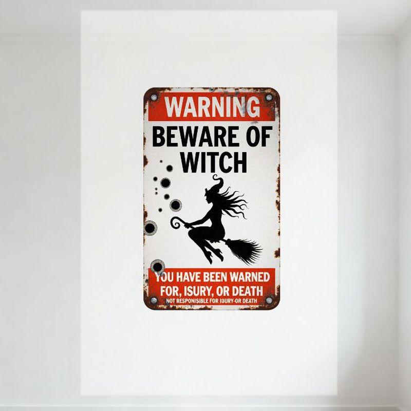 Vintage Weathered Warning Witch Tin Sign - Beware of Witch Halloween Home Decor with Bullet Holes, Rusty Edges, 'YOU HAVE BEEN W
