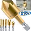 6PC Hexagonal Handle Titanium Plated Five Edge Chamfering Knife Countersunk Drill 6-19mm Woodworking Spot Facer Tool Set