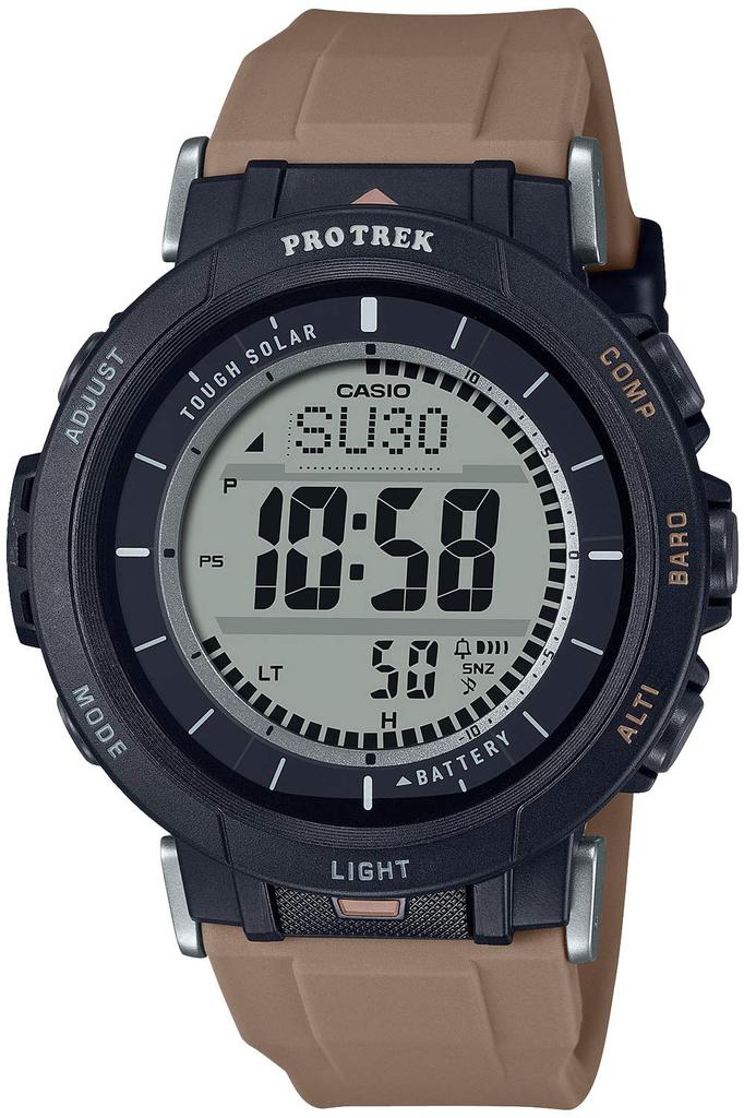 Z linii autentycznych zegarków outdoorowych "PRO TREK", ten model cyfrowy oferuje wygodne dopasowanie dla zwykłych użytkowników, takich jak wędrowcy i kempingowicze.. Zachowując praktyczność potrójnego czujnika i Tough Solar, rozmiar koperty jest mniejszy niż w poprzednim modelu. (PRG-330). Zaprojektowany tak, aby być dyskretnym nawet podczas długotrwałego noszenia, jest również lekki.. Plastikowy kształt ramki zapobiega zaczepianiu o mankiety, a wewnętrzna faza ma precyzyjnie wyprofilowane wykończenie, co zapewnia ostry wygląd.. Błyszczące metalowe elementy wewnątrz lunety dodają odrobinę tekstury. Klawisz bezpośredni po prawej stronie, który obsługuje pomiar z potrójnym czujnikiem, wykorzystuje lekkie plastikowe przyciski.. Oprócz tradycyjnych osłon przycisków PRO TREK, każdy przycisk ma charakterystyczną linię wypełnioną kolorem z wyraźną, łatwą do odczytania nazwą funkcji, aby zapobiec przypadkowemu naciśnięciu.. Przednie przyciski na godzinie 12 i 6 na kopercie są zaprojektowane z wypełnieniem kolorystycznym. Linie odniesienia służą do pomiaru kierunku kompasowego.. Z naciskiem na widoczność, wyświetlacz LCD wykorzystuje czcionkę bardziej pogrubioną i czytelną niż poprzednie modele, poprawiając czytelność wskazań czasu i różnych funkcji, nawet gdy światło jest włączone.. Zegarek posiada silikonowy pasek DuraSoft, który jest elastyczny i wygodny w noszeniu, nawet podczas długotrwałego użytkowania.. System wymiennych pasków pozwala na samodzielną zmianę paska, a akcesoria takie jak karabińczyki są również dostępne oddzielnie.. Technologia Tough Solar eliminuje potrzebę regularnej wymiany baterii, zapewniając stabilne działanie różnych funkcji, w tym potrójnego czujnika, który reaguje na zmiany w naturze, zapewniając również praktyczność.