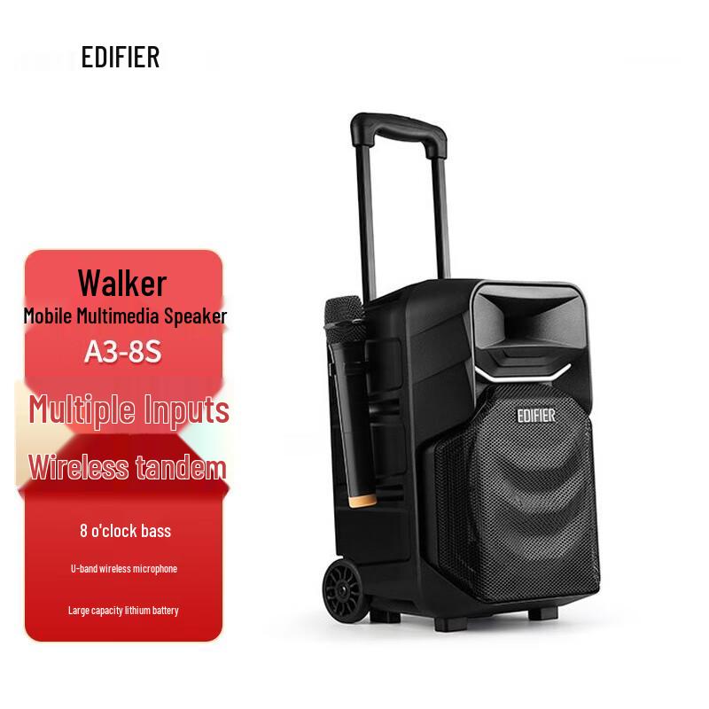 The Edifier D3-8s is an 8-inch portable Bluetooth trolley speaker designed for versatility. Ideal for outdoor events, square dance, and conferences, it features Bluetooth 5.0 connectivity for seamless audio streaming. Equipped with a built-in battery and convenient wheels, it offers excellent portability. This standard package includes a wireless microphone, and it also supports TF card playback for various audio sources.