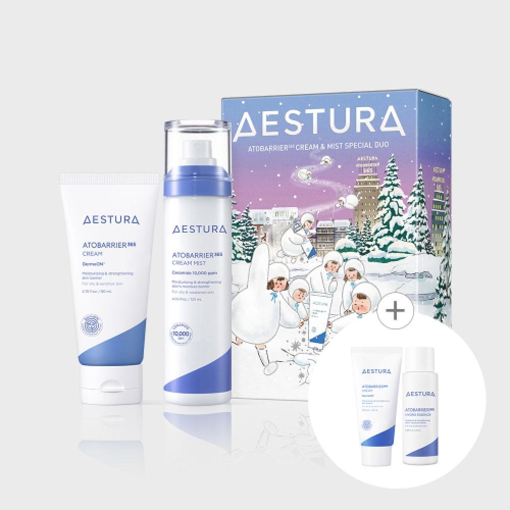 The AESTURA [Holiday] Atobarrier 365 Cream & Mist Set is designed to enhance the skin barrier, containing three essential ingredients—ceramide, cholesterol, and fatty acids—that maintain skin integrity. The Atobarrier 365 Cream delivers powerful hydration by penetrating deep into the skin, while the Atobarrier 365 Cream Mist provides rapid moisture replenishment with its high-hydration formula, suitable for daily use especially for dry and sensitive skin.