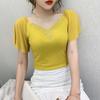 Kobiety Lato Koreańskie Ubrania T-Shirt Dekolt V Diamenty Falbankowe Rękawy Bluzki