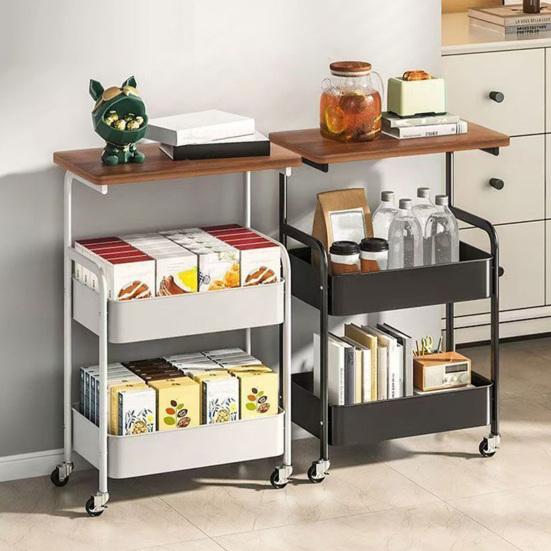 Trwałe materiały ze stylowym wykończeniem: Blat w kolorze drewna w połączeniu z opcjonalnymi białymi lub czarnymi koszami do przechowywania oferuje prostą estetykę retro, która uzupełnia różnorodne wystroje domów.. Wykonany z ramą ze stali węglowej, wózek charakteryzuje się dużą nośnością, wodoodpornością i łatwością czyszczenia, idealny do wilgotnych środowisk kuchennych.