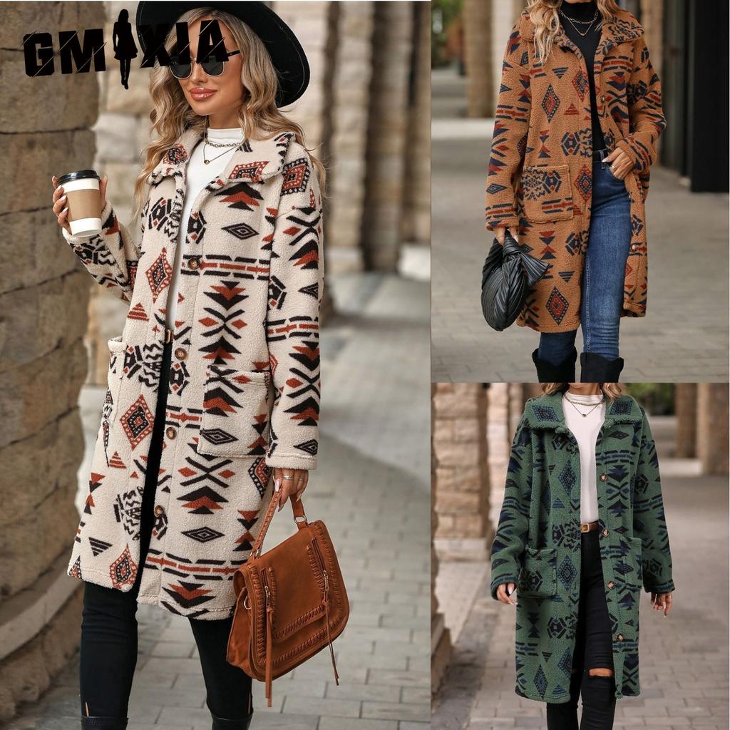 GMXIA Autumn and Winter Women's Clothing Single-breasted Ethnic Style Printed Plush Long Coat