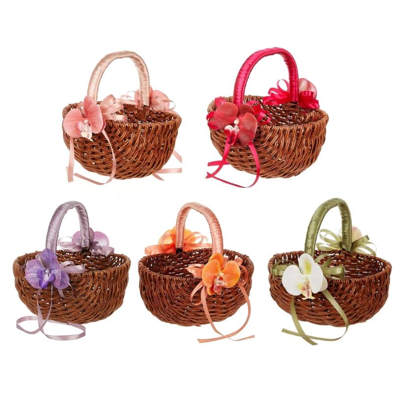 Eleganckie koszyczki dla dziewczynek z rattanu z uchwytem z pereł i wstążką, koszyk na słodycze na ceremonię ślubną i dekorację domu