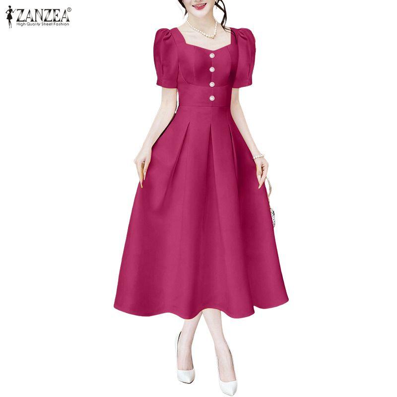 ZANZEA Damska swobodna sukienka z kwadratowym kołnierzykiem i krótkim rękawem na lato