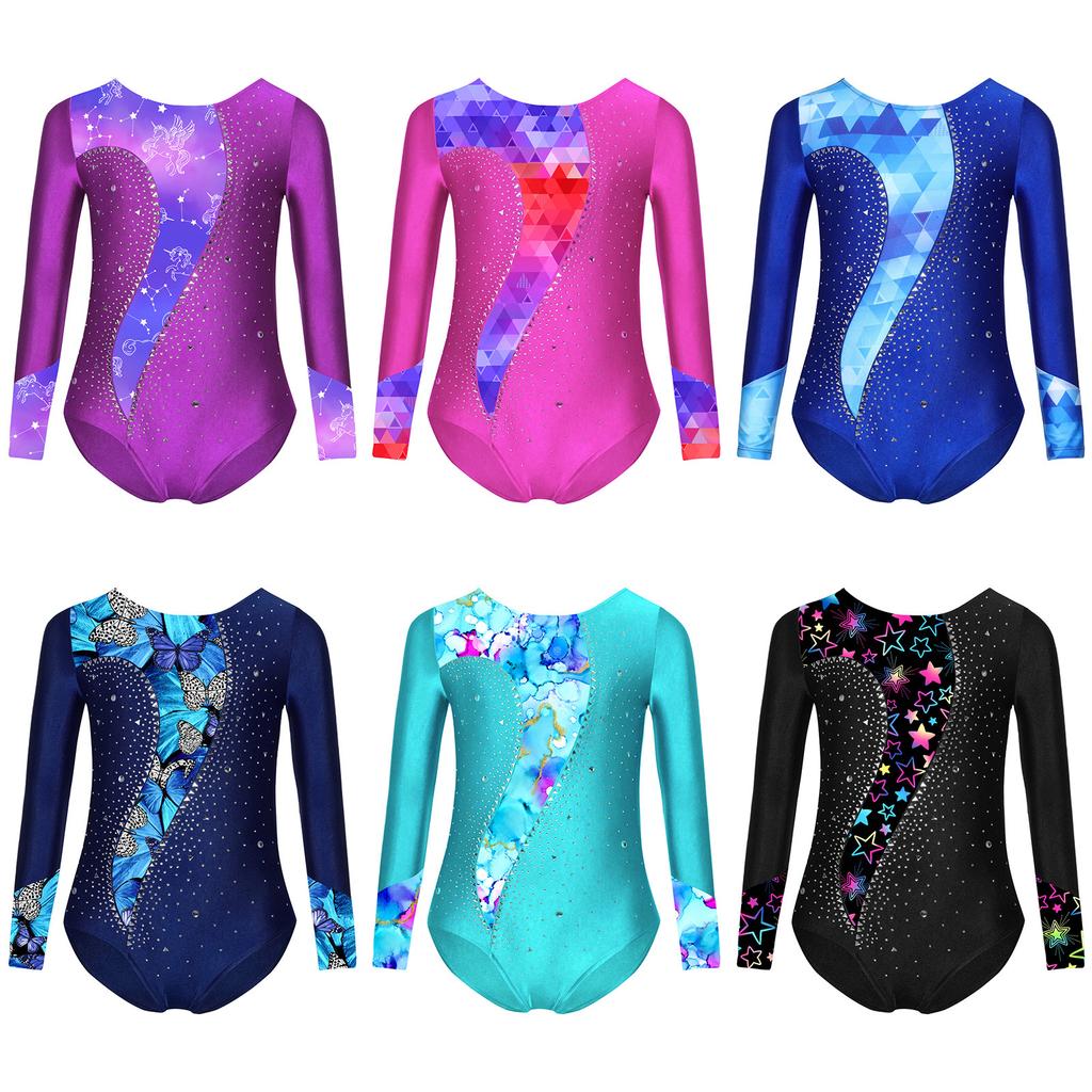 Dziewczęcy trykot do tańca z długim rękawem, patchworkowy kombinezon ze strasami na trening gimnastyczny i występy