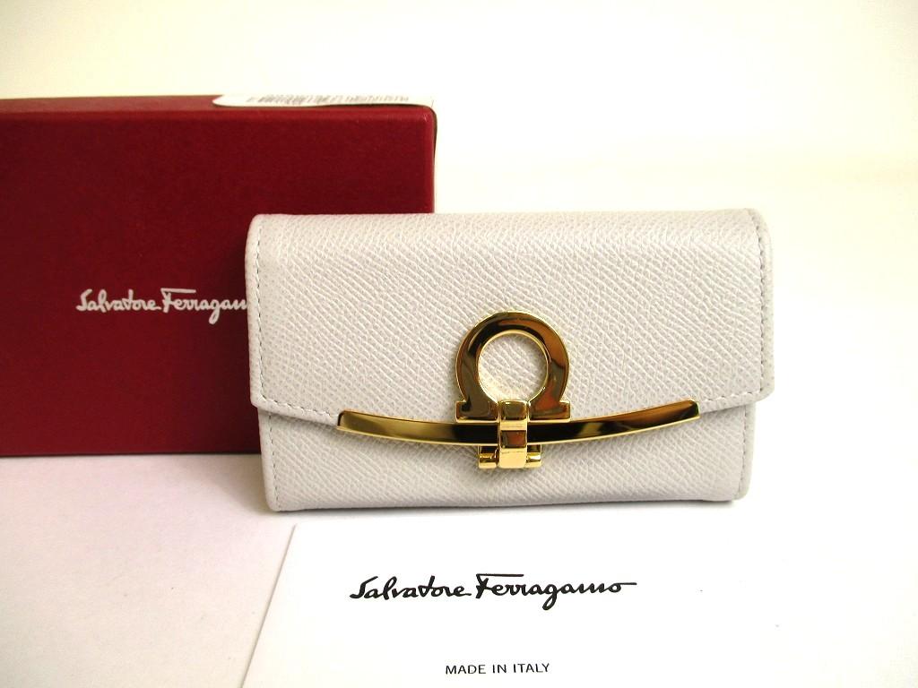 Product : Salvatore Ferragamo Gancini Light Gray Leather Gold H/W 6Pics Key Chain #a980