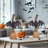 The product is a broom bat ornament that adds a spooky touch to any space. This creative ornament features a realistic bat with spread wings and bright red eyes perched on a quaint broom, creating a mysterious atmosphere. Made of high-quality resin, it has a smooth surface that is easy to clean and maintain, ensuring durability.