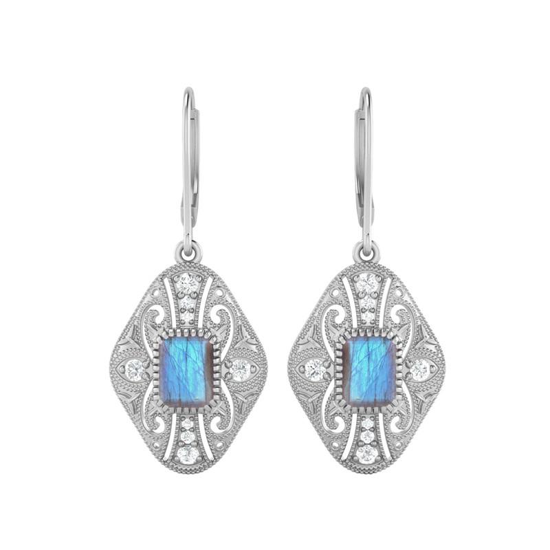 925 sterling silver filigree earrings featuring 4.28 Ct octagon-shape labradorite. Vintage-inspired design with milgrain detailing, perfect for elegant gifting.