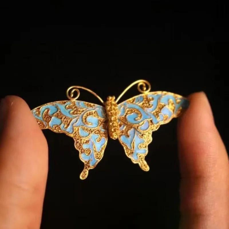 Palace Style Exquisite Butterfly Brooch For Women Fashion High Quality Ancient Gold Craftsm Blue-Green Enamel Vintage Jewelry