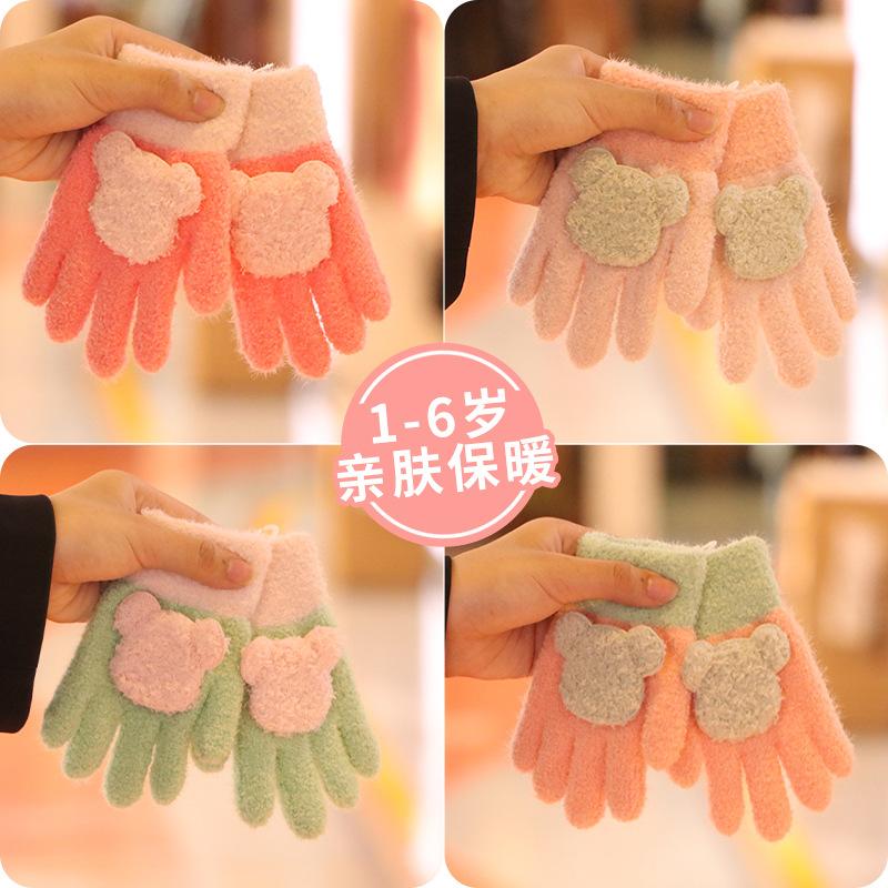 Children's gloves full finger cute bear velvet thickened warm skin-friendly hand care children outdoor play knitting autumn and winter