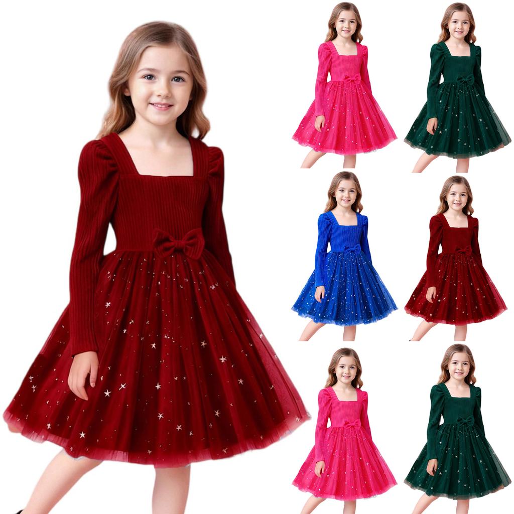 Dziewczęca modna sukienka z długim rękawem z siateczkowymi panelami i nadrukiem w gwiazdki, z paskiem z kokardą