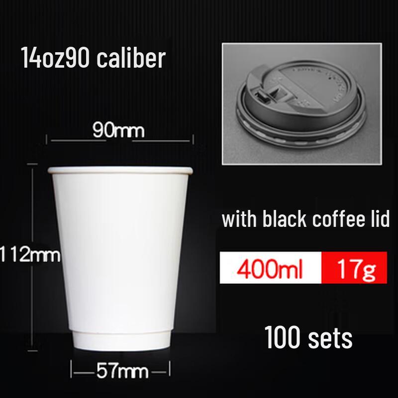 Miaojiayi 400ml Disposable Insulated Paper Cups with Black Lids, 100 Sets
