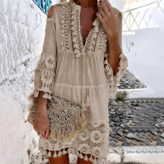 Deep V Neck Mini Dress Solid Color Women Tassel 45720 Sleeve Shift Dress