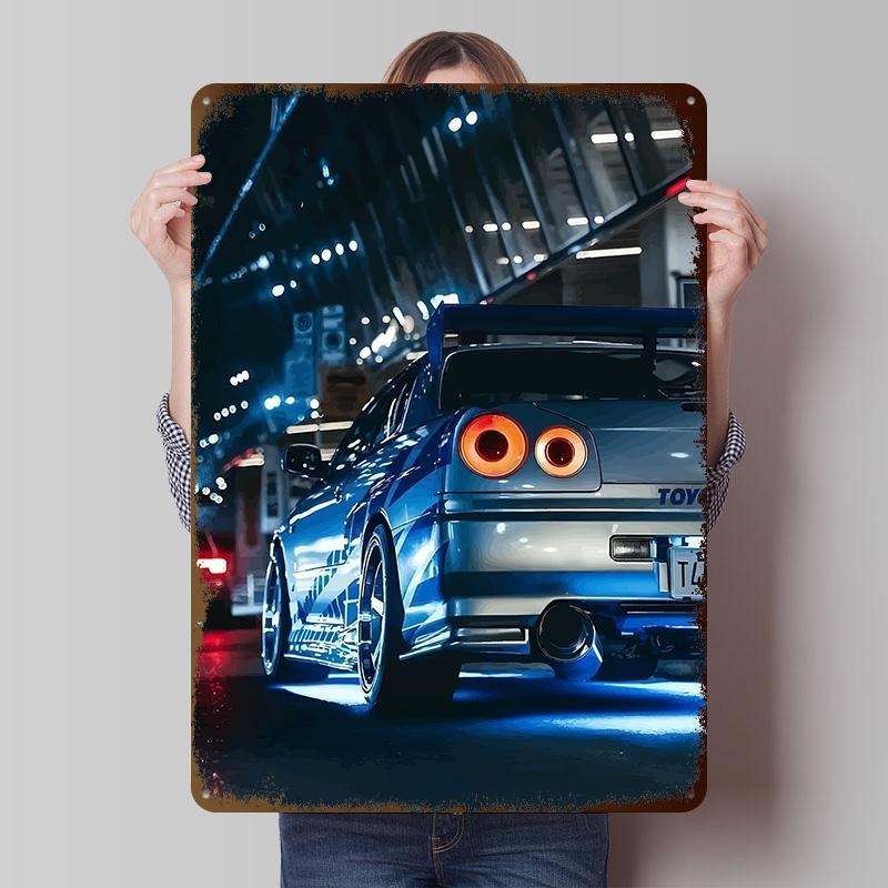 Blue Sports Car Skyline R34 Rear View Printed Poster Customized Wall Art Retro Vintage Metal Tin Signs for Home Bar Accessories